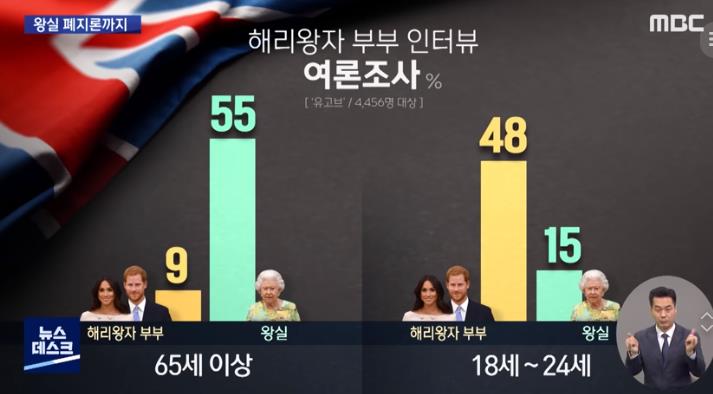 영국의 보수나 중장년층에는 55% 왕실편이 더 많았고