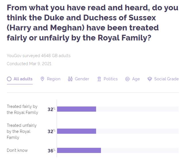 "왕실과 헨리 왕자 부부 중 어느 쪽을 동정하느냐"고 물었더니 22%가 부부를 동정했다고 답했지만,