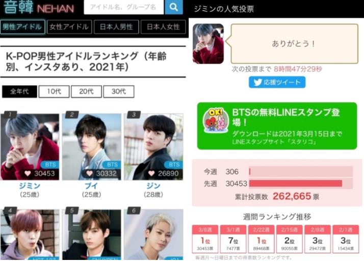3월 8일부터 14일까지 30453표를 받아 일본에서의 한국 아이돌 중 가장 큰 인기를 차지했는데요.. Nehan은 한국 아이돌의 주간 인기 순위를 제공하는 일본의 인기 웹 사이트입니다.