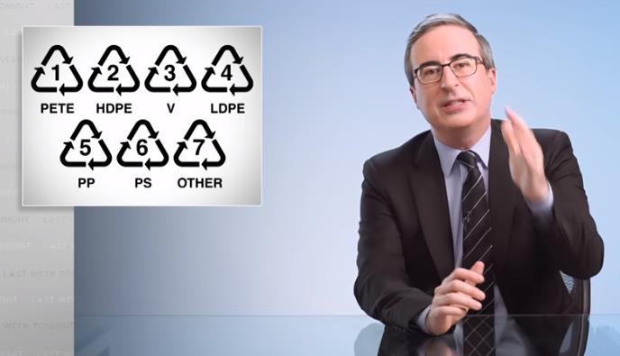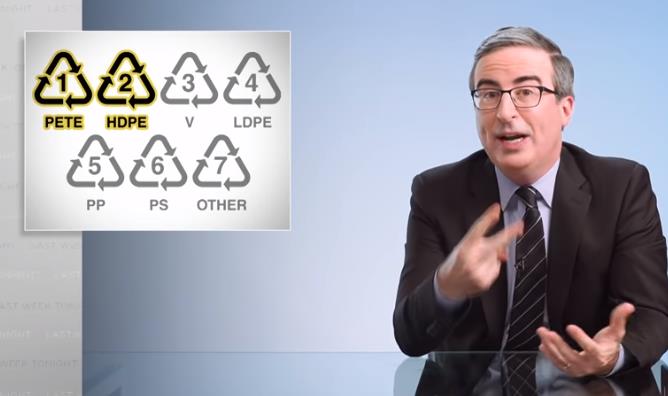 존 올리버씨는 플라스틱의 9% 미만이 실제로 미국에서 재활용되며 대부분이 매립지나 바다에 버려진다고 말했습니다.