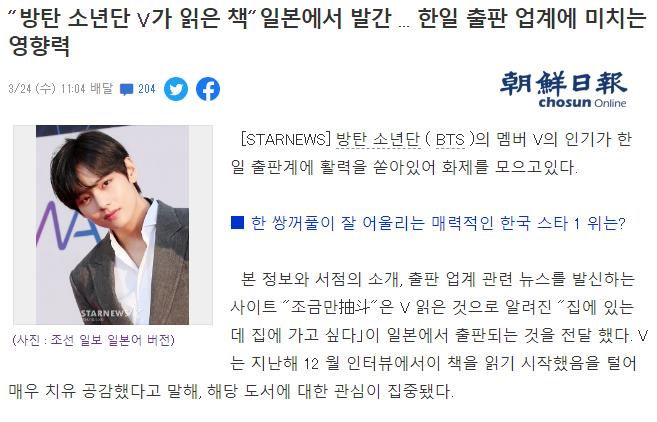BTS 방탄소년단 뷔는 일본에서 가장 임팩트가 있는 멤버로서 뷔 솔로곡 Sweet Night로 일본 아이튠즈 1 위를 차지한 유일한 한국 아이돌이며 지금까지도 차트에 올라가 있으며 뷔는 지난 인터뷰에서 가장 좋아하는 책을 언급한 적이 있는데 이 책이 일본에 출간한 지 3일만에 아마존 재팬 베스트셀러 1위가 될 정도로 브랜드 파워가 있습니다.