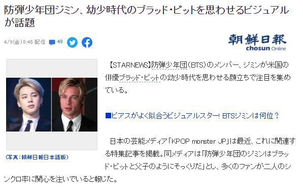 일본 연예매체 KPOP monster JP는 최근 이와 관련한 특집기사를 게재했는데 이 매체는 "방탄소년단의 지민은 브래드 피트와 부자처럼 닮았다"며 많은 팬들이 두 사람의 싱크로율에 관심을 쏟고 있다고 보도했습니다.
