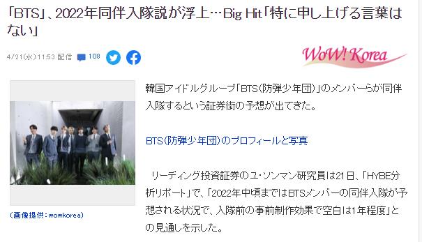 전원 동시인지 몇 명인지 알 수 없고, 이 기사에 있는 동반입대가 사실인지는 모르겠지만, 특히 막내라인은 지금부터 입대해도, 제대 후 아직 젊고, 그런 것을 생각해도 가능한 한 빨리, 이 코로나 사이에 끝내고 돌아와줬으면 해.