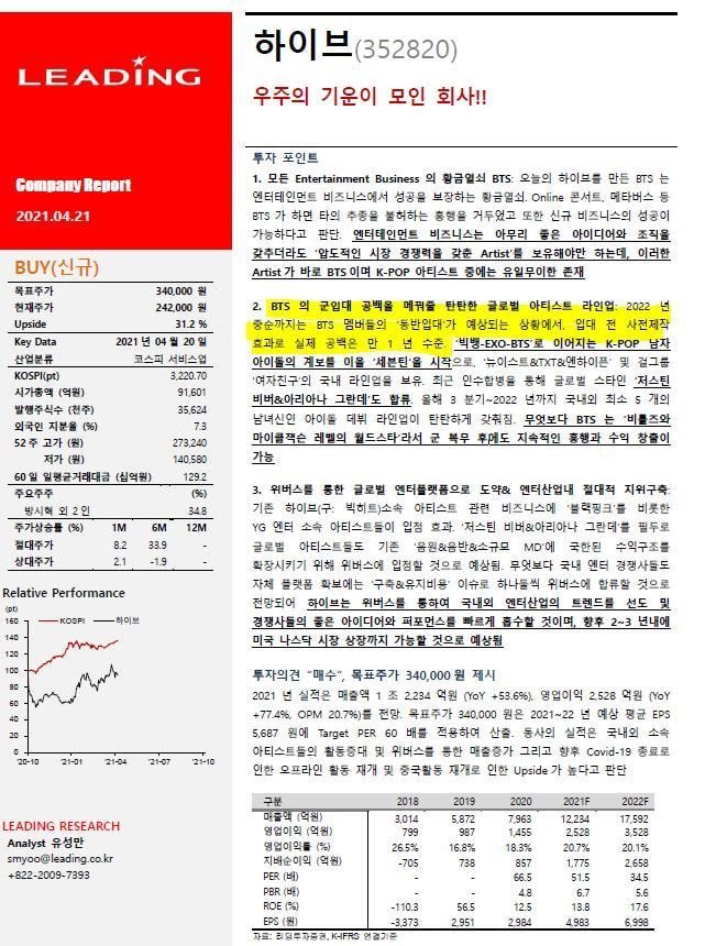 이어 그는 HYBE 주식에 대해 340,000원의 목표 주가로 HYBE 주식에 대해 "매수"를 평가했으며, 레이블에는 방탄소년단의 입대에 따라 활동이 중단할시 글로벌 아티스트 라인업을 갖고 있다며 세븐틴 뉴이스트 투모로우바이투게더(TXT)