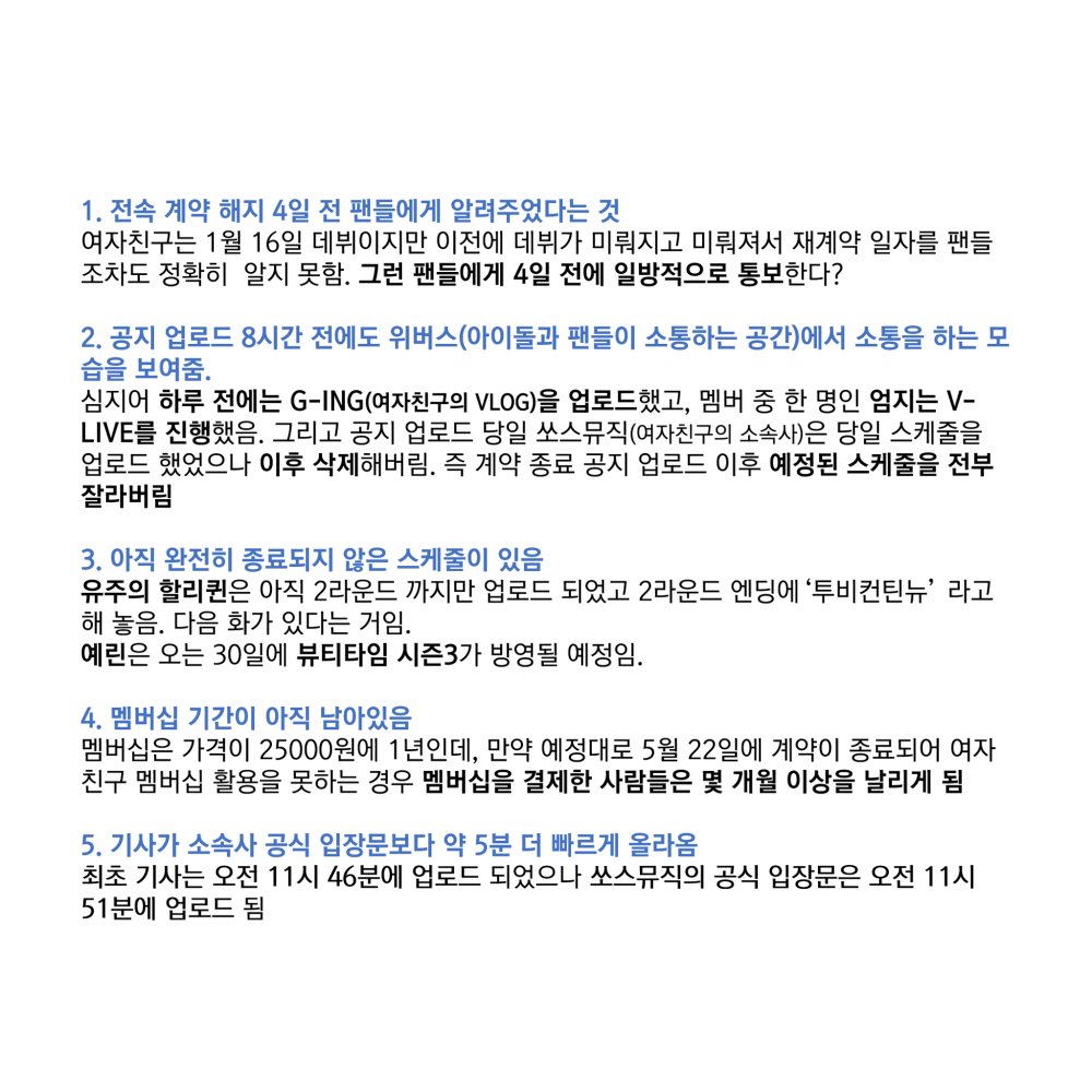 쏘스뮤직은 여자친구 해체 4일전 통보에 대한 입장문내세요. 기사가 먼저 터져서 위버스 공지 띄운거, 장수돌 되고 싶다고 여러번 언급하고 다음 앨범 기대하는 멤버들을 해체 공지엔 각자의 길을 가겠다고 개인활동에 혈한된 애들처럼 표현한 것, 컨텐츠 냈다가 갑자기 삭제한 것, 팬싸 환불건 해명해 pic.twitter.com/7Y5itelYXD