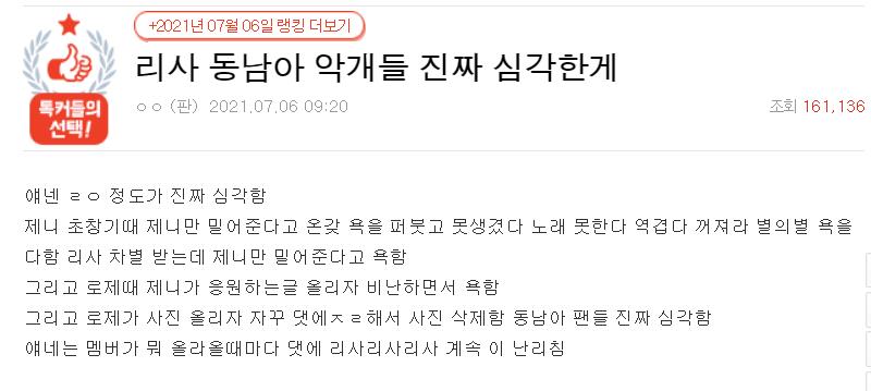 네티즌은 "동남아 리사 악개들이 진짜 문제다. 그 정도는 진짜 문제다. 블랙핑크가 처음 홍보할 때 제니가 회사에서 밀어주는 유일한 사람이라고 제니에게 욕설을 퍼부었다. 그녀가 못생겼고 노래도 못한다며 온갖 저주를 했어요.