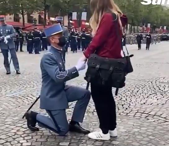 파리의 연례 바스티유 데이 퍼레이드가 시작되기 직전 샹젤리제 거리에서 예상치 못한 프로포즈 영상이 포착됐습니다.