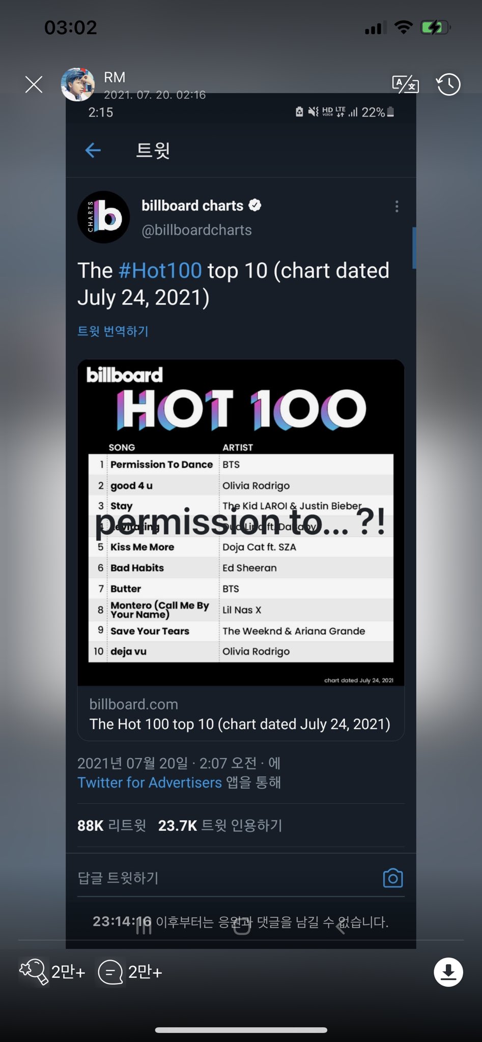 방탄소년단 (BTS)의 세번째 영어 신곡 '퍼미션 투 댄스'(Permission to Dance)가 빌보드 핫 100차트 메인 1위에 올랐습니다. 한마디로 '버터'곡과 바톤터치를 하고 1위를 달성한 셈인데요...