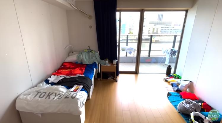 독일 탁구선수가 공개한 내부는 튼튼한 종이침대와 발코니가 있고 옷장은 크지 않아서 밖에 짐을 내놨다고 전했습니다.