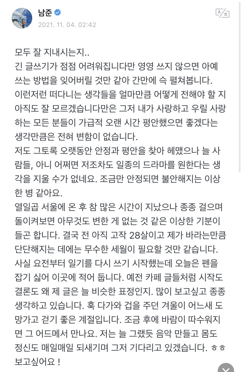 방탄소년단(BTS) RM이 새벽에 위버스에 적은 글이 화제입니다