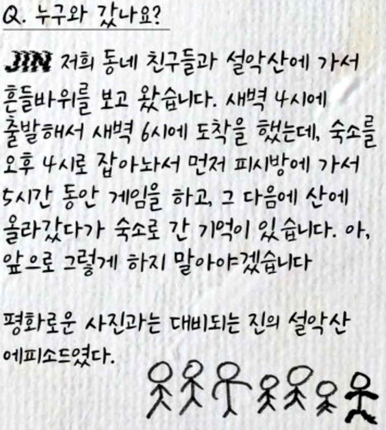 예전 팬들이 진의 설악산 간 썰을 팬들에게 푼것도 화제가 되기도 했습니다.