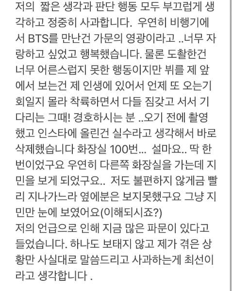 "물론 도촬한건 너무 어른스럽지 못한 행동이지만 뷔가 제앞에서 보는건 제 인생에 있어서 언제 또 오는 기회일지 몰라 착륙하면서 다들 짐갖고 서서 기다리는 그때! 경호하시는 분.. 오기 전에 촬영했고 인스타에 올린건 실수라고 생각해섯 바로 삭제했습니다.. 화장실에 100번..설마요.. 딱 한번이었고 우연히 다른 쪽 화장실을 가는데 지민을 보게 됐구요.