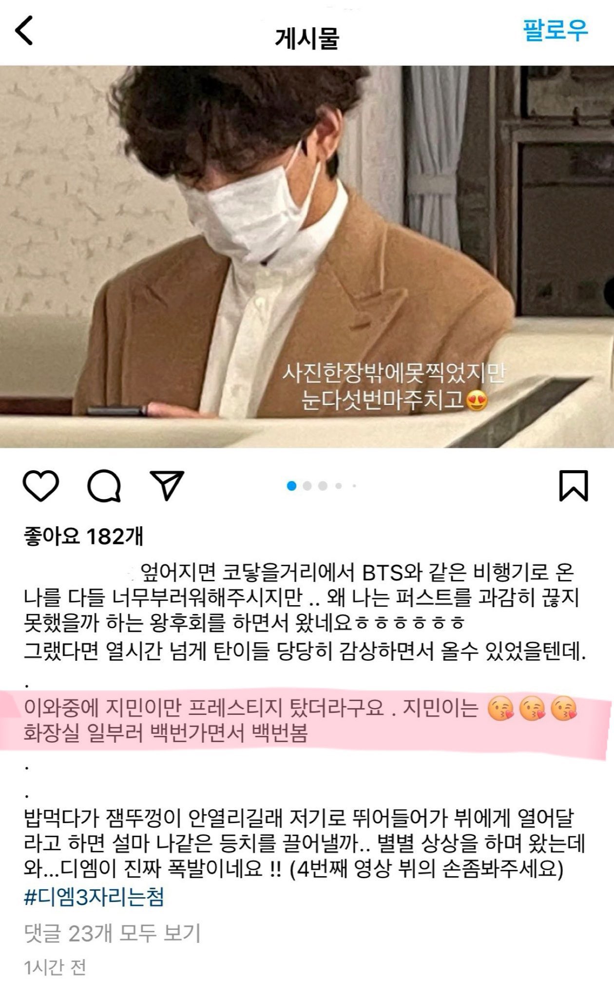 다른 방탄소년단은 퍼스트클래스를 탔지만 지민이만 프레스티지를 타서 화장실가면서 백번봤다고 자랑을 하기도 했는데 이 인스타 글이 올라오자마자 팬덤은 혼란스러웠습니다..