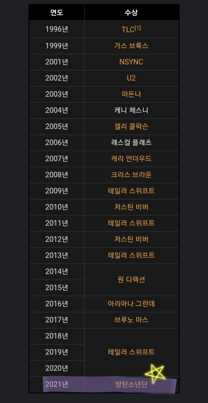 미국 로스앤젤레스 마이크로소프트 시어터에서 열린 2021 AMA에서 방탄소년단은 대상에 해당하는 '아티스트 오브 더 이어'를 수상했습니다.