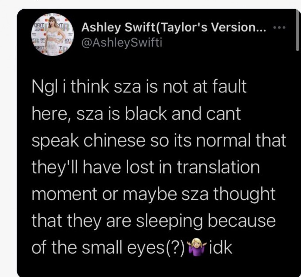 이제 SZA의 팬도 마찬가지입니다. ARMY는 그녀에게 많은 인종 비방을 보냈고 어떻게 든 SZA의 팬들은 인종 비방을 되돌려주려고 했는데 이 기사는 그녀의 팬들이 갑자기 인종차별주의자처럼 보이는군요. 실제로는 반격을 하고 있는 거죠. 그러니 두 팬덤 모두 잘못됐습니다. 또한 SZA는 사과해야하구요.