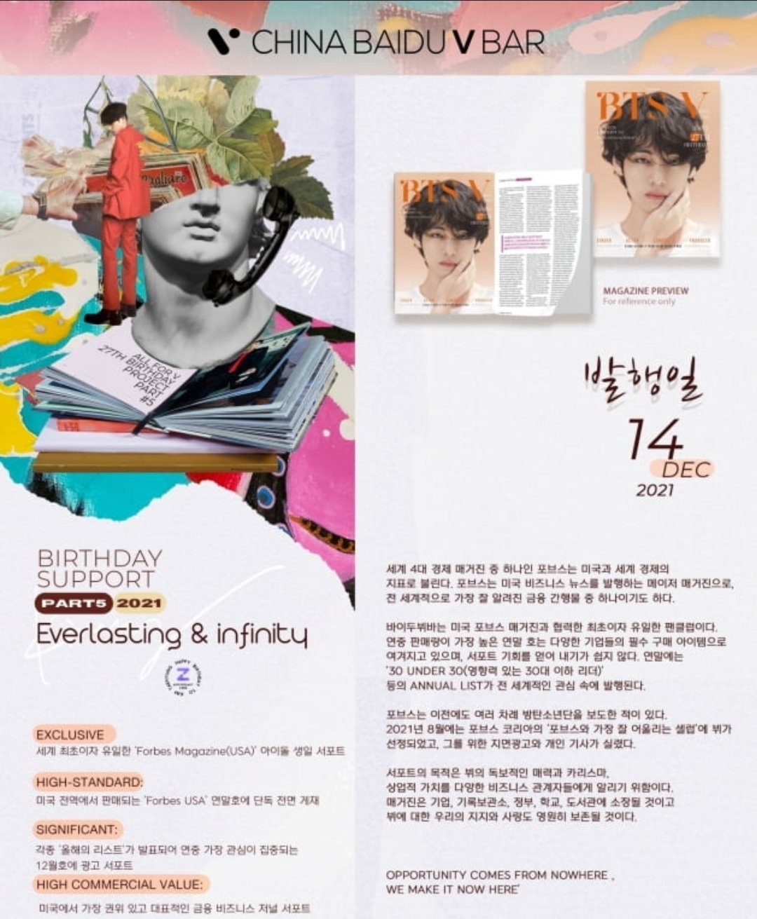 뷔 중국 최대 팬클럽인 '차이나 바이두 뷔바 (CHINA Baidu Vbar)'는 미국 전역과 전 세계를 대상으로 판매되는 'Forbes USA' 12월호에 뷔의 생일을 축하하는 광고를 게제한다고 밝혔습니다.