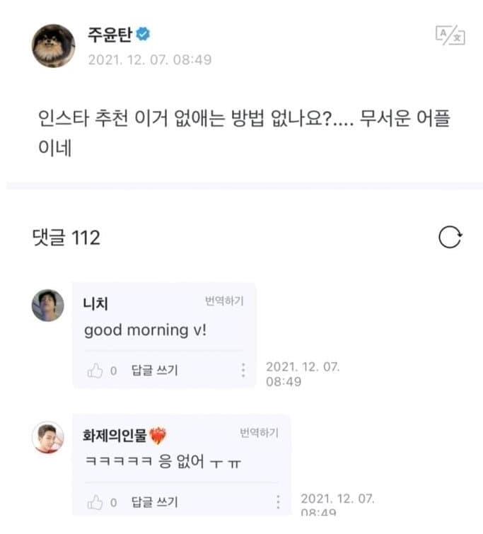 그 뒤 뷔는 위버스에 와서 이런 소리를 합니다.