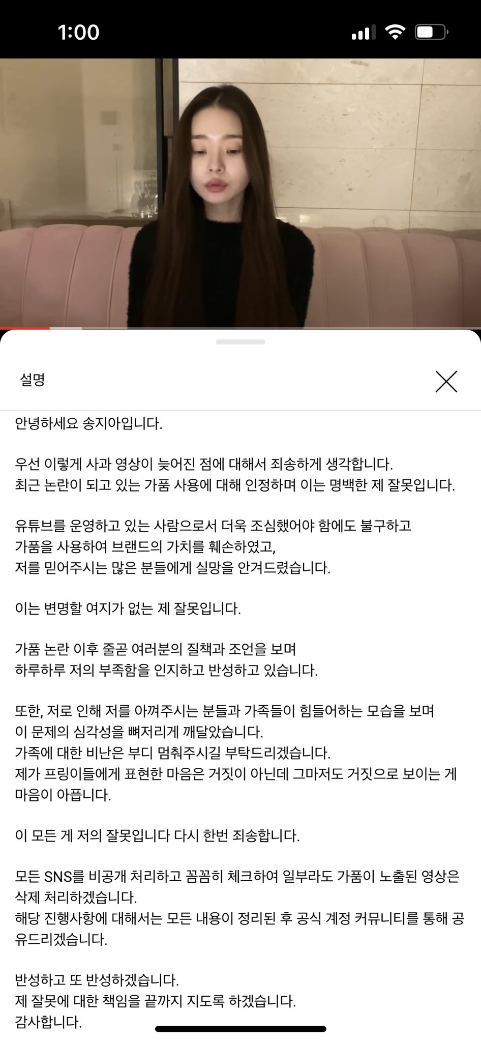 브랜드 가치를 훼손한 점 잘못했고 많은 사람들이 사랑해줄때 내면을 돌아봤어야 했다. 보여지는 송지아에 집중했던 거 같다. 모든게 자신의 잘못이며 반성하겠다는 사과의 말을 남겼습니다.