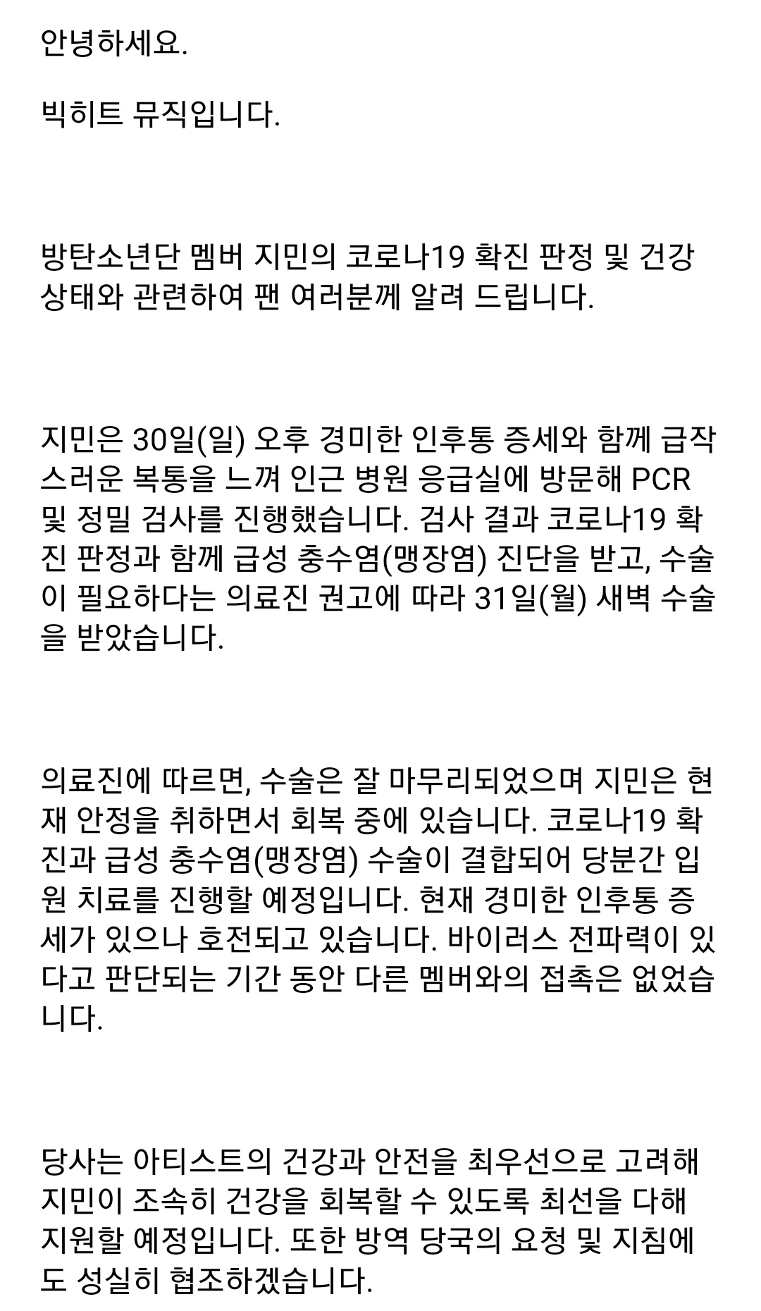 30일 지민은 경미한 인후통 증세와 함께 급작스런 복통으로 응급실로 이동했고 PCR 검사 후 코로나 19확진과 함께 맹장염 판정을 받아 31일날 새벽에 수술했습니다.