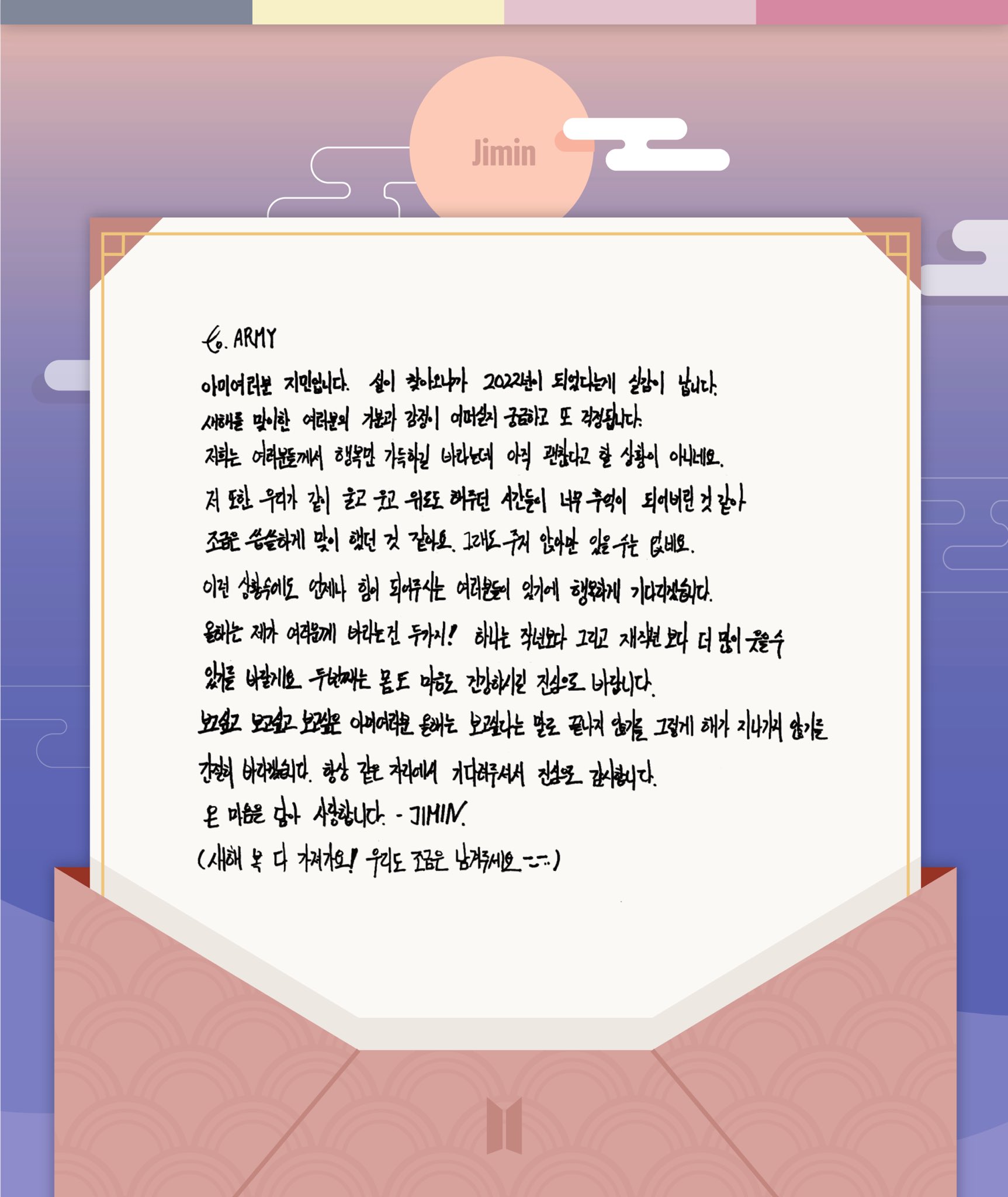 아미여러분 지민입니다. 설이 찾아오니까 2022년이 되었따는게 실감이 납니다. 새해를 맞이한 여러분의 기분과 감정이 어떠실지 궁금하고 또 걱정됩니다.