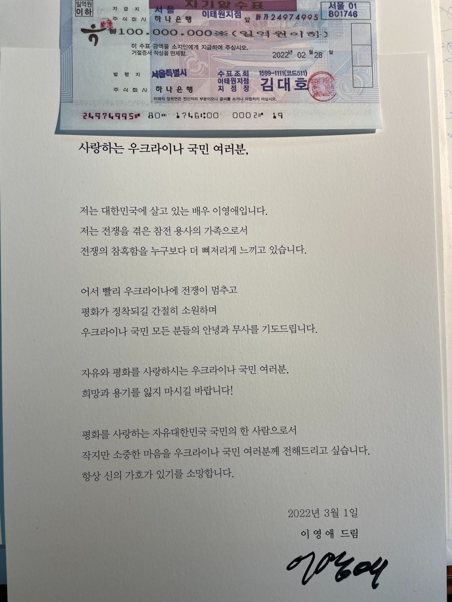 🇺🇦❤️🇰🇷We are very excited and touched by the letter and the great financial contribution of the famous Korean actress Lee Young-Ae in support of Ukraine and the demand to end the war as soon as possible! The donations will be transferred to the needs of victims of 🇷🇺 aggression. pic.twitter.com/YAmiMQTwjx