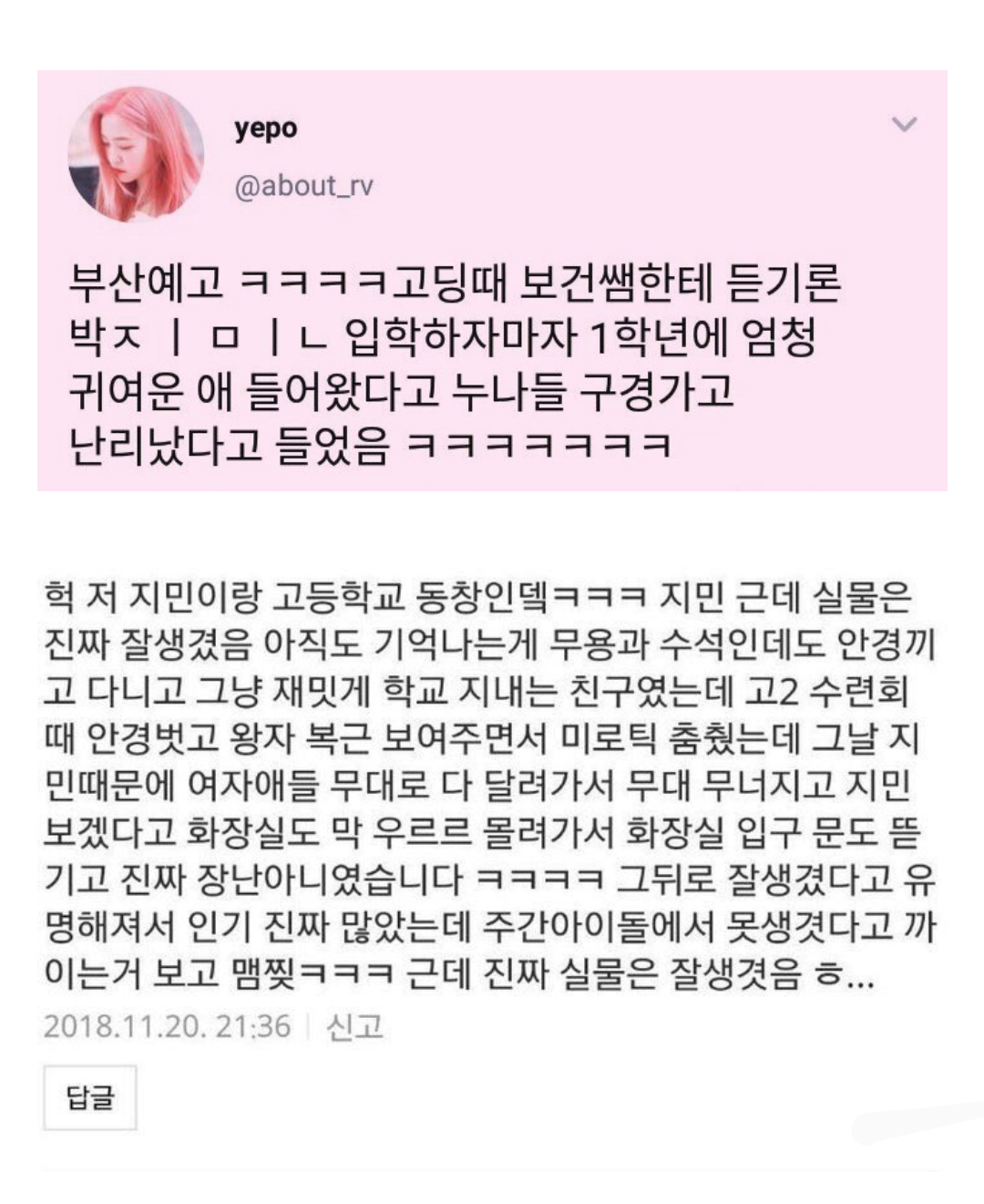 지민은 고 2때 선생님의 만류에도 불구하고 아이돌을 위해 부산예고를 자퇴하고 서울에 있는 한국예고로 전학갔는데 한국예고마저 2019년 문을 닫으면서 이로인해 지민이 다녔던 초, 중학교는 물론 서울로 전학간 고등학교까지 없어지며 부산예고만 유일하게 현존하는 지민의 모교로 외신의 입소문을 타기 시작했습니다.