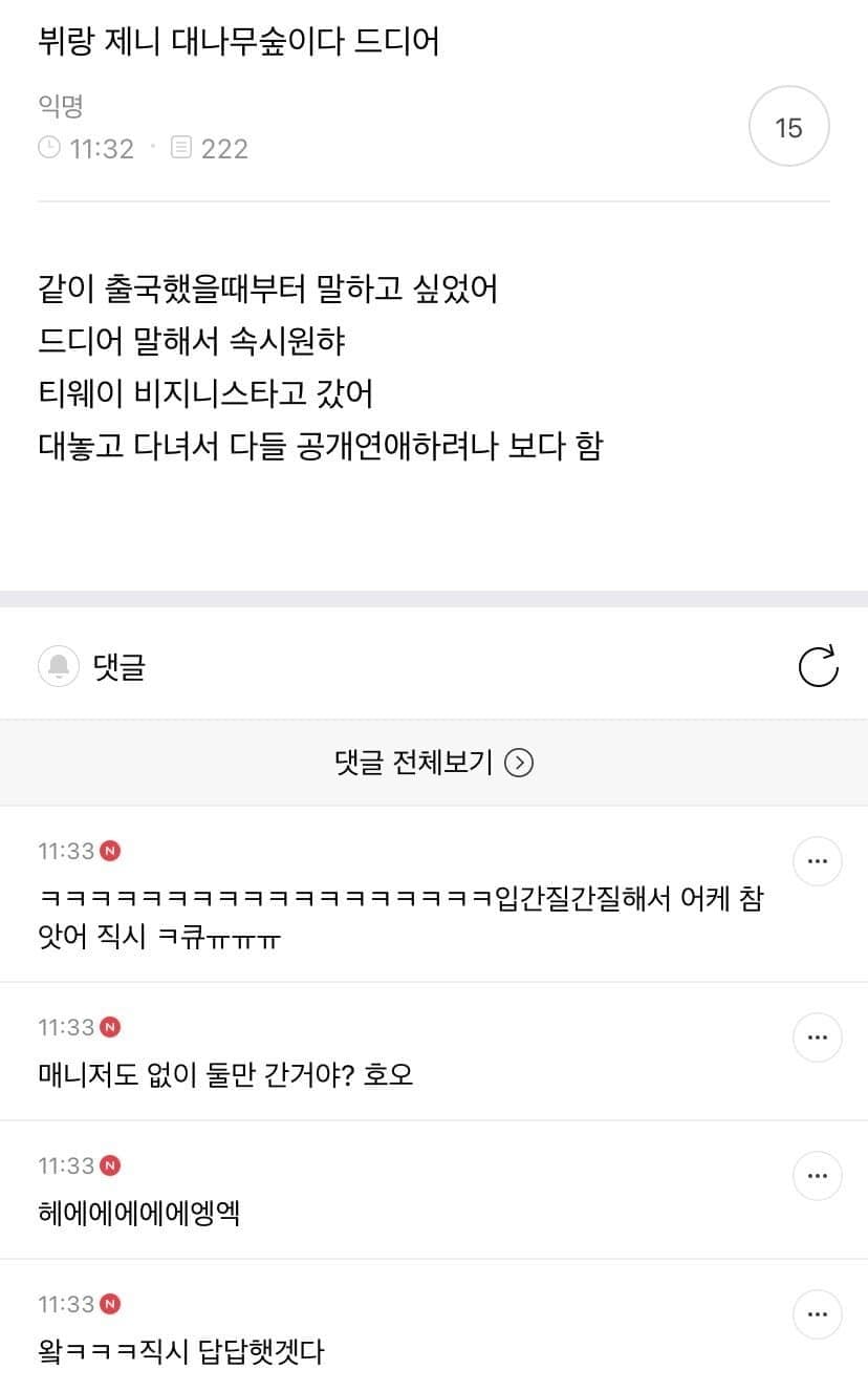 익명게시판에는 이런 글이 올라왔는데 출국할때 둘의 목격담을 전하며