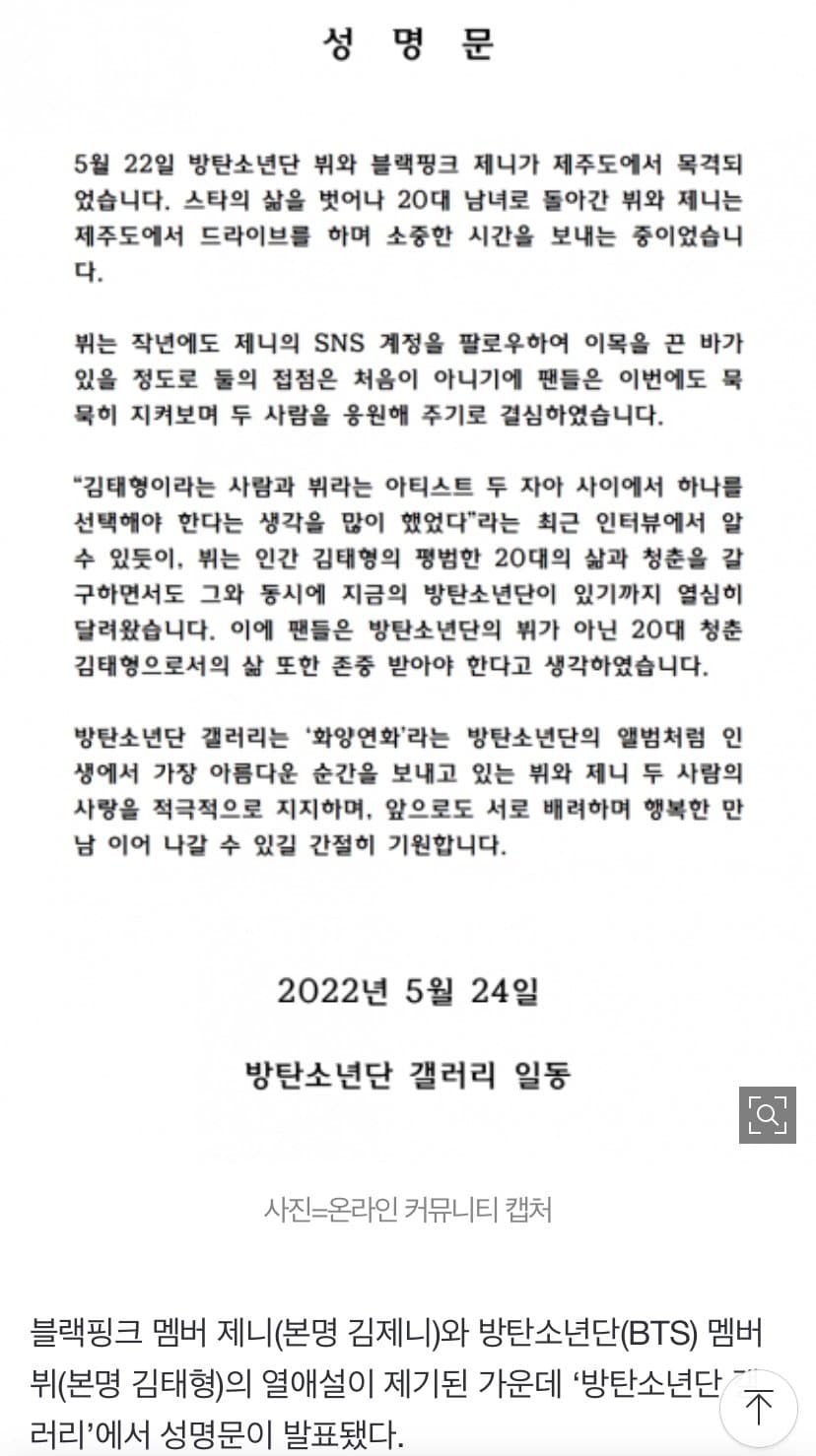 그 후 방탄소년단 갤러리란 곳에서 성명문을 올렸다는 보도가 올라왔는데 둘의 관계를 지지한다는 내용이었습니다.