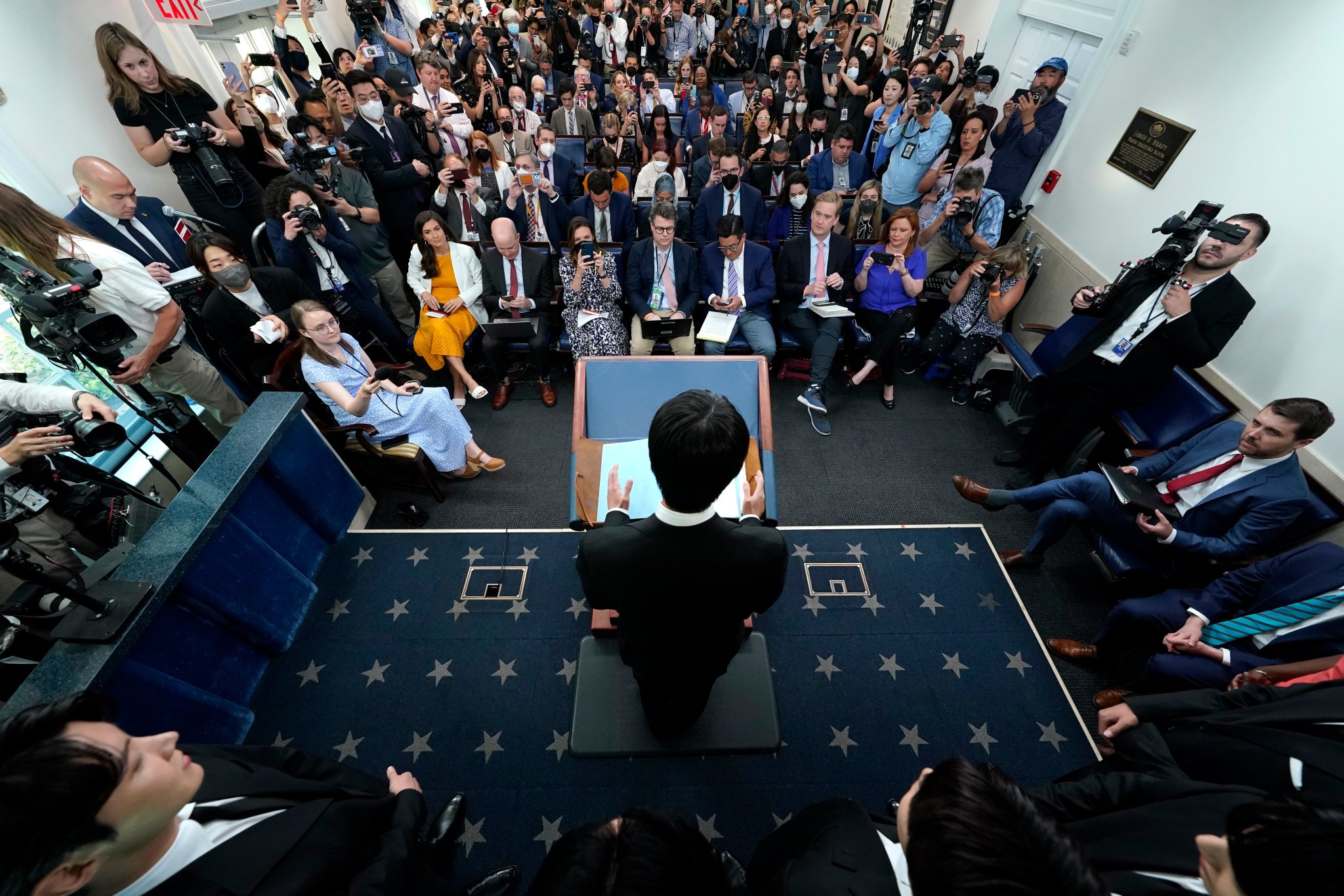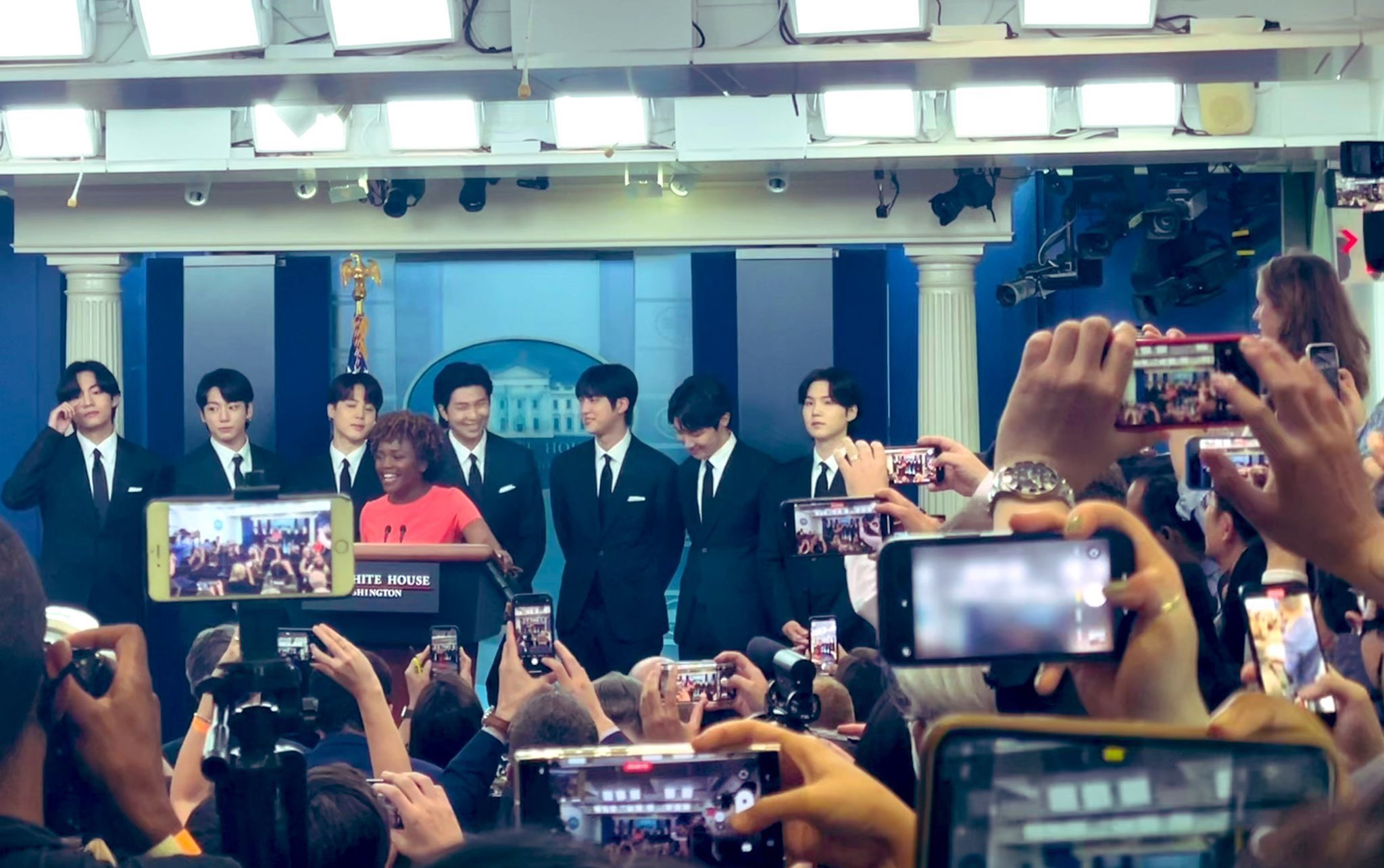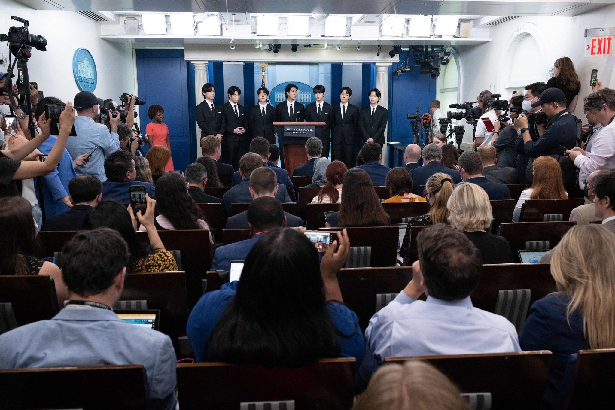 일본뿐 아니라 많은 외신기자들이 방탄소년단을 찍기 위해 백악관 브리핑실을 꽉 채웠는데 원래 가로세로 7줄씩 앉는 총 49석이지만 외신기자들 100명이 서서 BTS 인터뷰를 보기위해 몰려들었고 통로까지 다 꽉 채웠다고 하는군요..