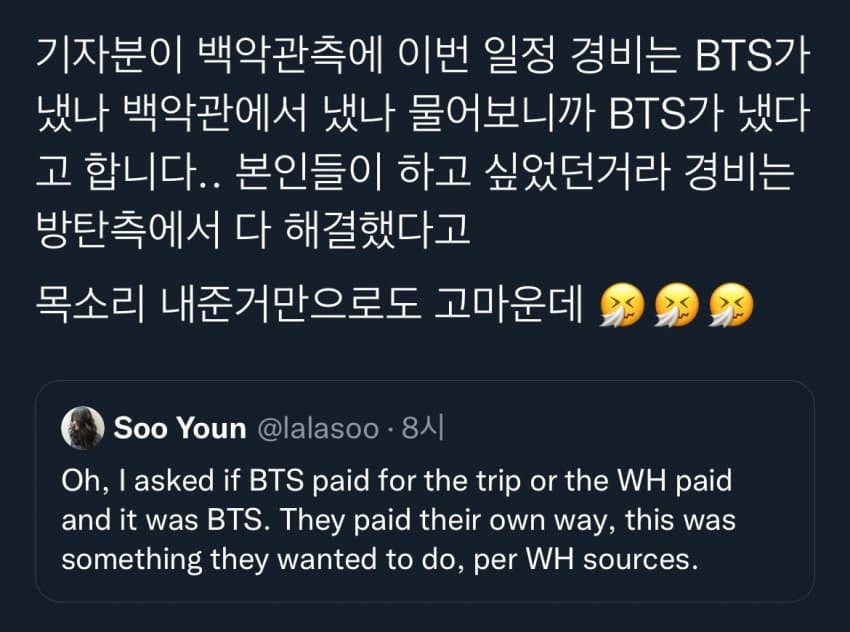 백악관에 간것도 방탄소년단 자비로 간거거든요..