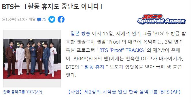일본 방송에서 15일, 세계적인 인기 그룹 「BTS」가 발매한지 얼마 되지 않은 앤솔러지 앨범 「Proof」의 매력에 다가서는, 3밤 연속 특별 프로그램 「BTS 「Proof」TRACKS」의 제2밤이 온에어.아미(BTS의 팬)에게는 친숙한 DJ·고가 마사토루가, BTS의"활동 중지"보도가 있던 것을 보고 급히 생방송했다.