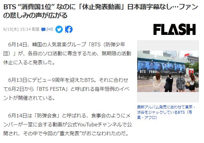 하지만 이렇게 팬이 기하급수적으로 늘어나고 있는데 이번 방탄소년단 유튜브에 올라온 '방탄 회식'의 중대 발표에 관해 영어나 스페인 자막은 있는데 일본어 번역 자막이 없었다고 하는데요. 거기 관련한 일본 기사입니다.