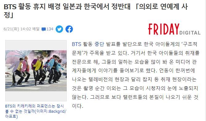 일본에서 방탄소년단의 개별활동으로 일본 연예계와 비교하는 기사가 나왔네요.