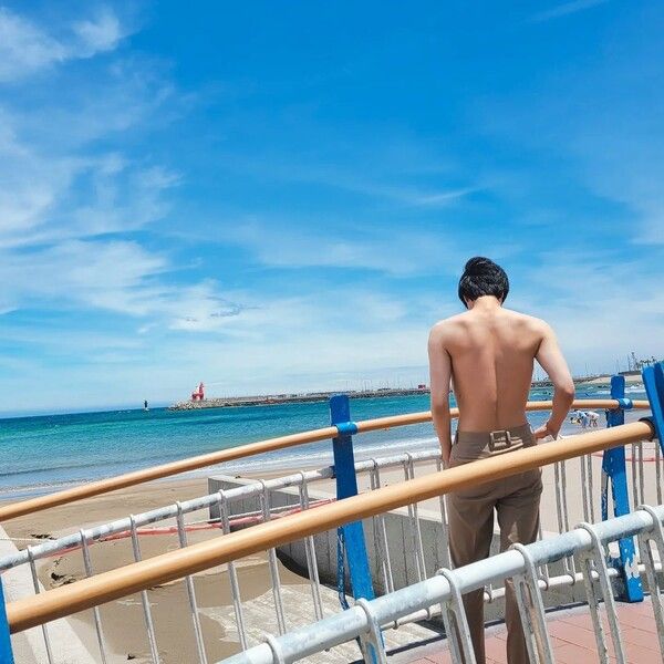 26일 드디어 바닷가를 찾은 진의 자신있는 넓은 어깨의 상체를 공개했습니다.