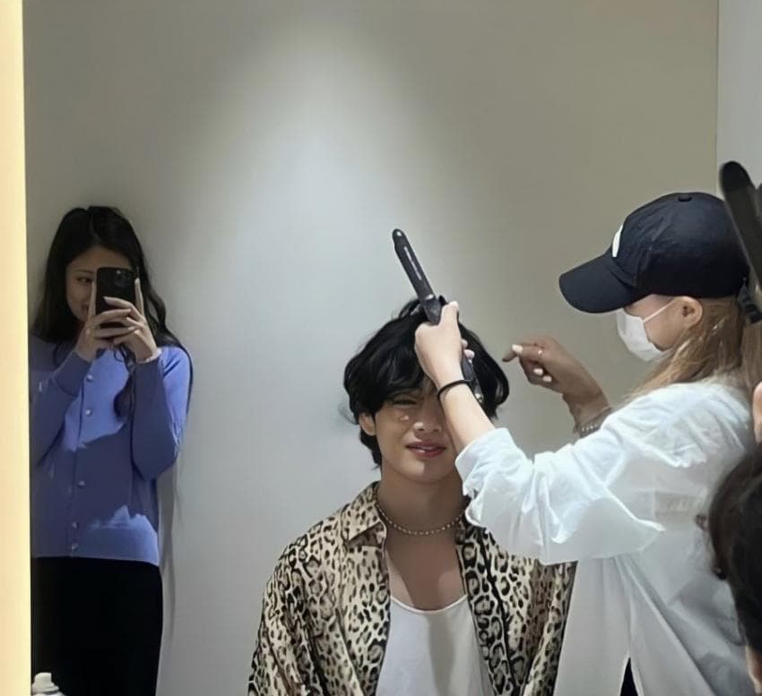 사진은 뷔가 지난 셀린느 가기 전 대기실에서 머리를 하고 있는 모습으로 보입니다.