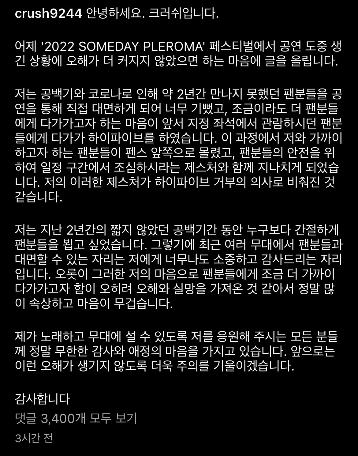 이날 크러쉬는 Beautiful’를 부르면서 관객들과 악수를 나누자 관객들이 더 앞으로 밀려오게 됐는데요. 그러자 크러쉬는 안전을 위한 행동을 한다는게 순간 오해가 생겼다고 해명했습니다.