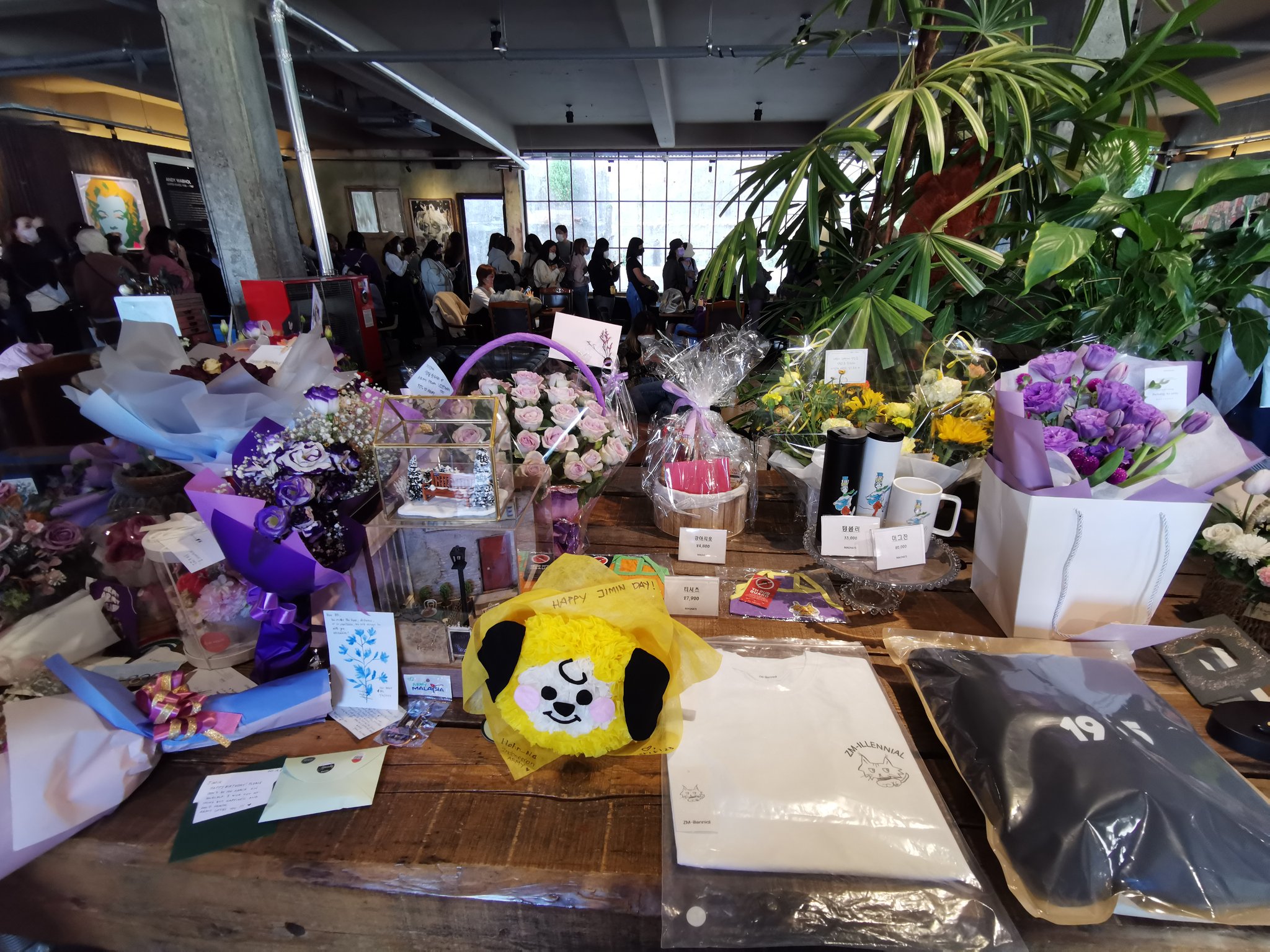 지민 생일 축하 꽃과 선물을 놓고가고 굉장히 많은 인원이 기다리고 있네요.