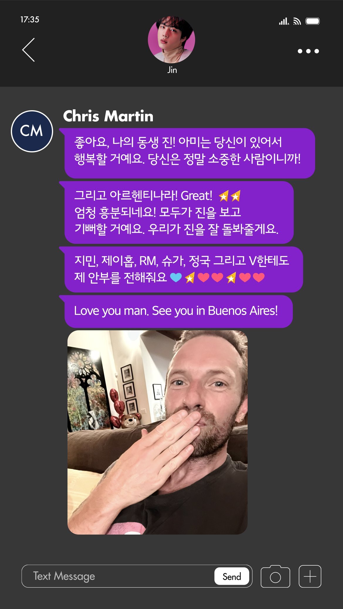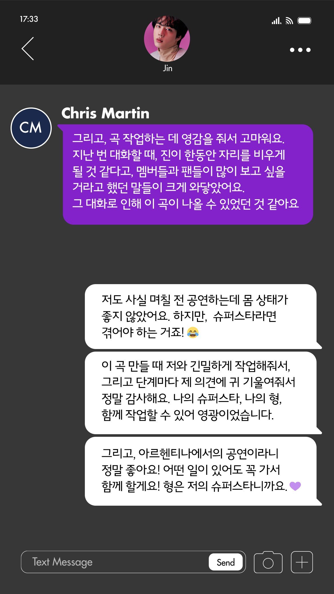 진과 영국 그룹 콜드플레이의 리더인 크리스 마틴은 진의 안부인사를 물으면서 특별 게스트로 와줄 수 있냐고 물었는데요.