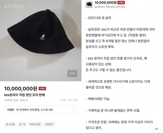 지난 17일 외교부 직원이라고 밝힌 남자가 BTS 정국이 여권을 만들기 위해 외교부를 방문하고 모자를 놓고 갔는데 진짜 외교부 직원이라며 인증하고 번개장터에 1000만원으로 올린 사실이 논란이 되고 있는데요.
