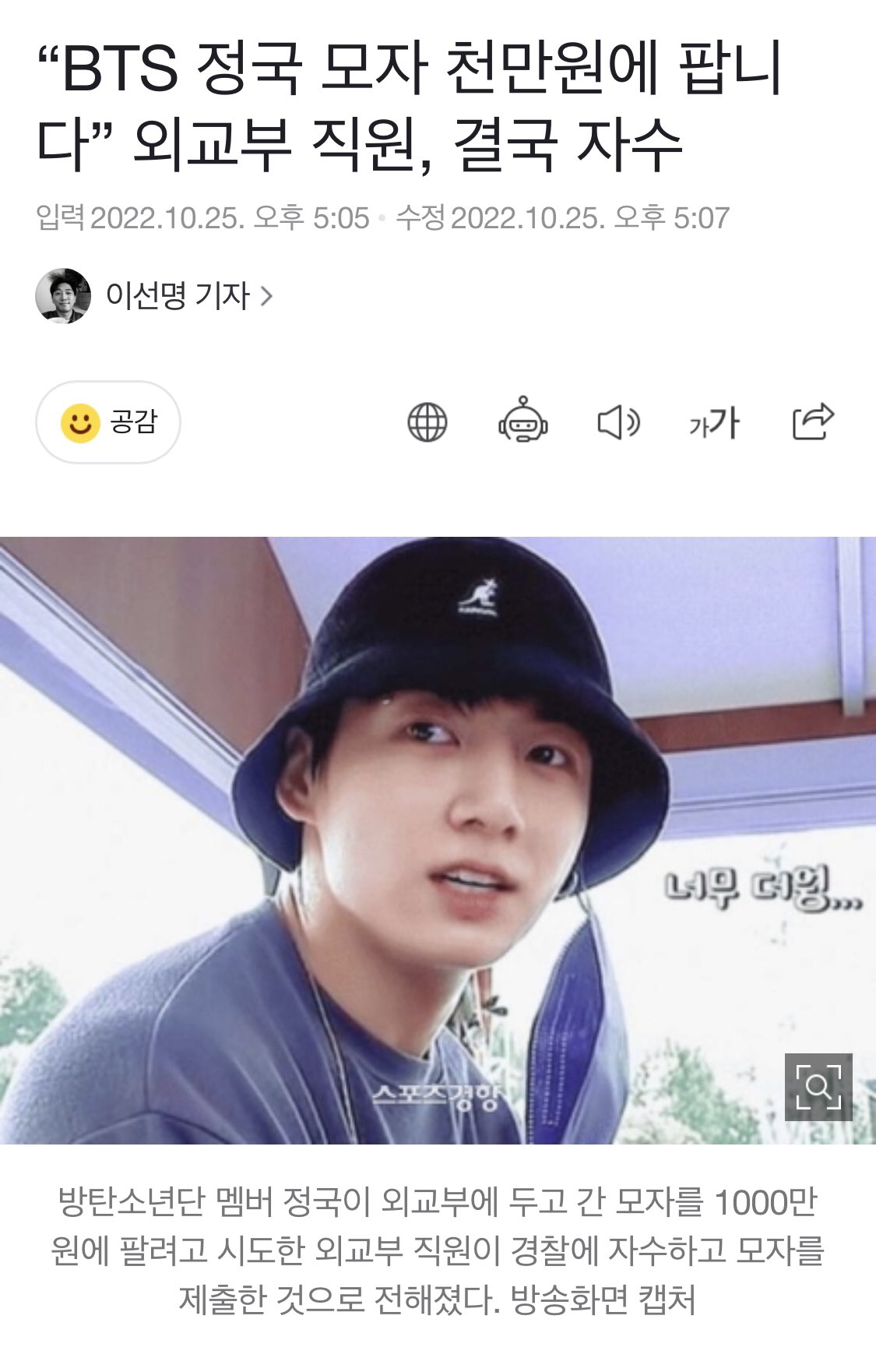 외교부 직원이 중고시장에 올린 정국의 모자가 논란이 되고 있습니다.