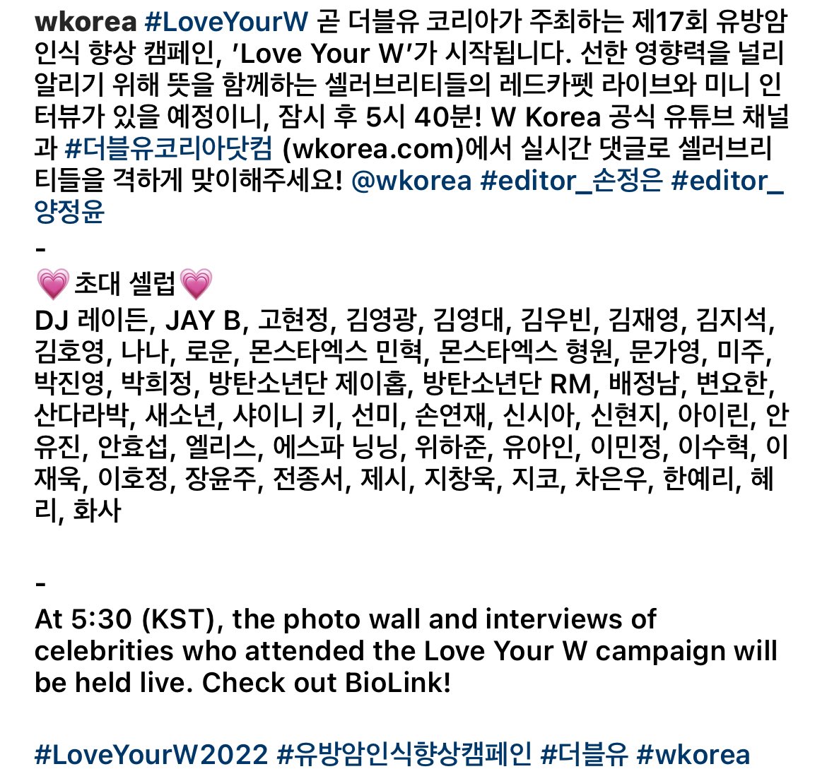 제17회 더블유 코리아 유방암 인식 향상 캠페인 자선 행사에 방탄소년단 BTS RM과 제이홉과 많은 스타들이 참석했습니다.