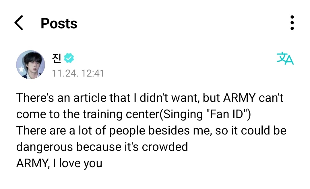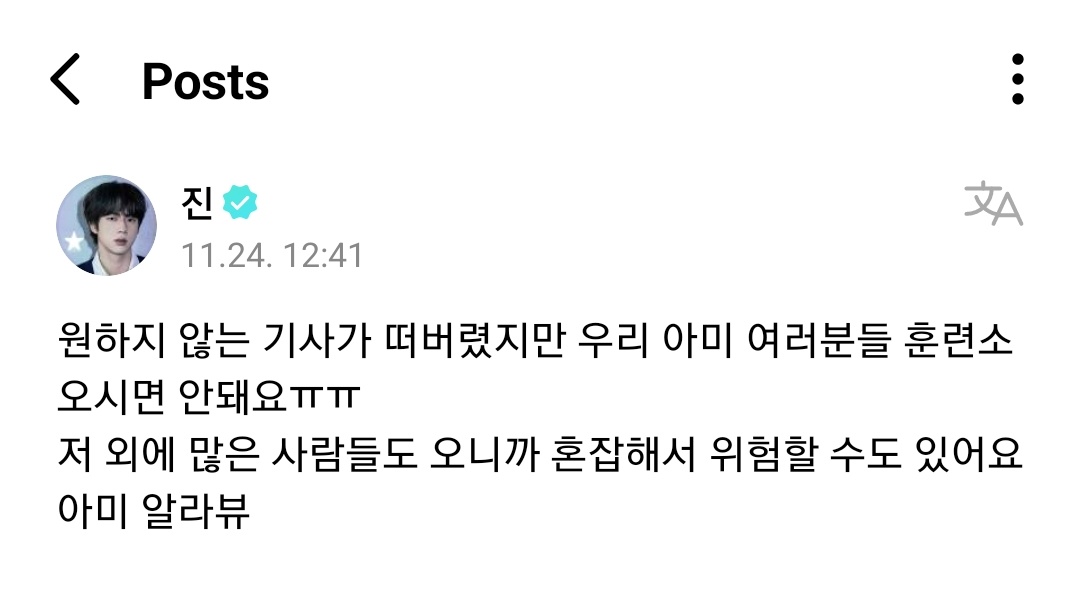 "원하지 않는 기사가 떠버렸지만 우리 아미 여러분들 훈련소 오시면 안돼요 ㅠ ㅠ