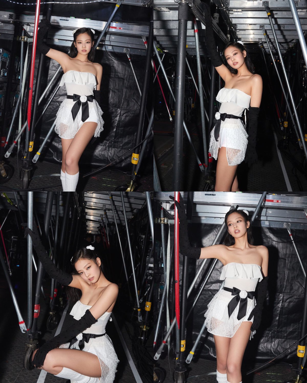 샤넬은 제니가 앰버서더답게 샤넬 커스텀 의상을 제작했는데요.. 러플과 레스 조젯 디테일의 보디수트에 화이트 까멜리아로 장식된 블랙 리본 벨트까지 그야말로 샤넬 분위기였습니다.
