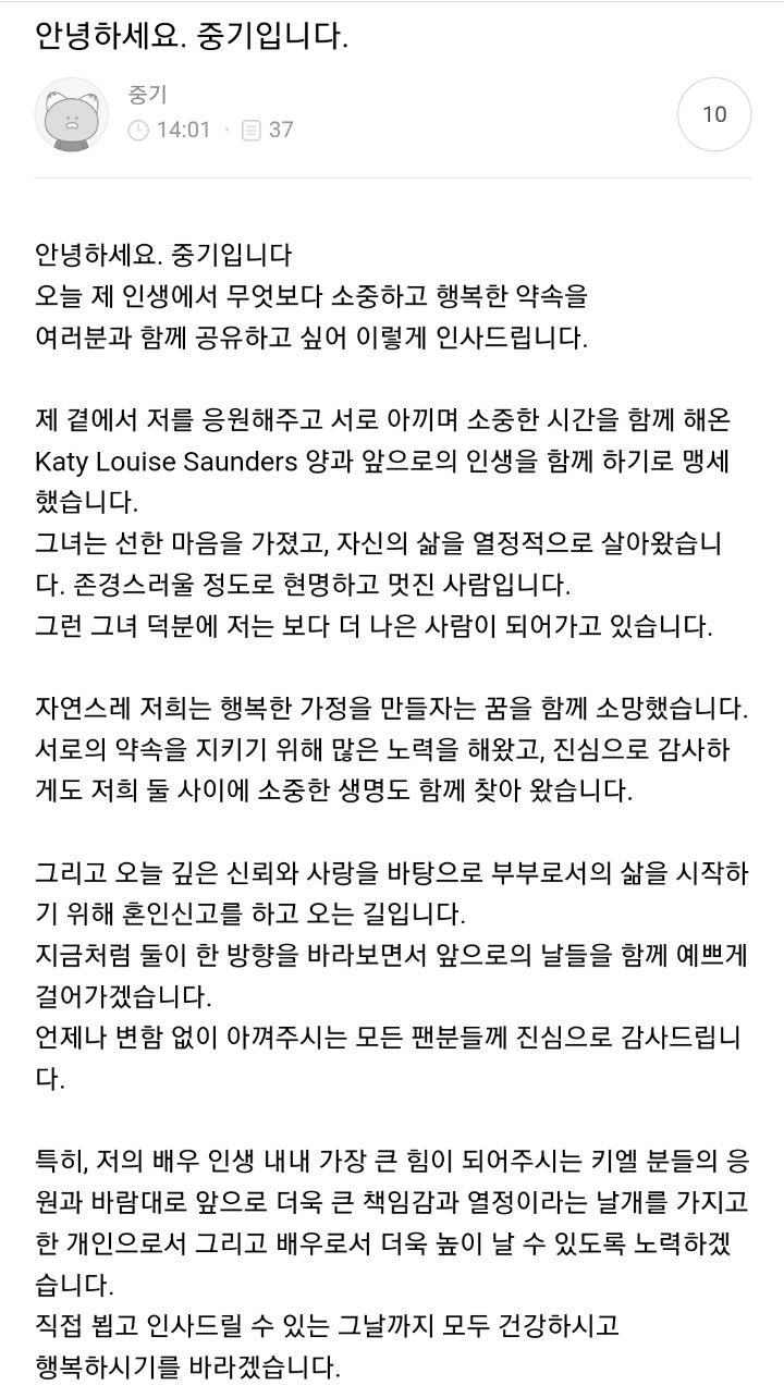 송중기는 자신의 팬 카페에 임신 소식을 알려며 케이티 루이스는 선한 마음과 삶을 열정적으로 살아온 존경스럽고 현명한 사람이라고 결혼한다고 밝히기도 했습니다.