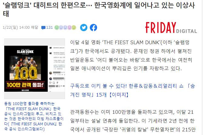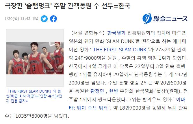 세월이 변하면서 그 위치를 한국이 차지하면서 컨텐츠 왕국이었던 일본의 위상이 잊혀질 무렵 20년만에 영화 애니로 재탄생된 슬램덩크가 한국에서 폭발적인 인기를 끌면서 일본에서도 기사가 쏟아지고 있습니다.