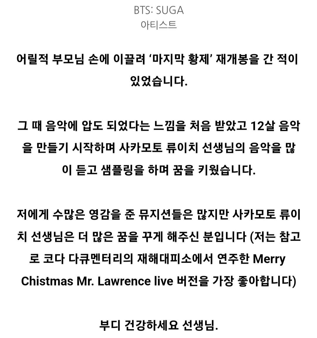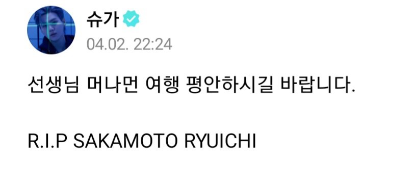 류이치 사카모토는 많은 아티스트들에게 영감과 존경을 받았으며 방탄소년단 BTS 슈가는 자신의 인스타에 이런 글을 남겼습니다.