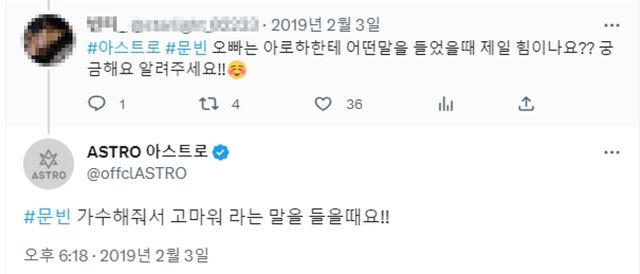 어느날 한 팬이 "문빈 오빠는 아로하 (팬덤 닉네임)한테 어떤 말을 들었을 때 제일 힘이 나요?? 궁금해요 알려주세요!!"