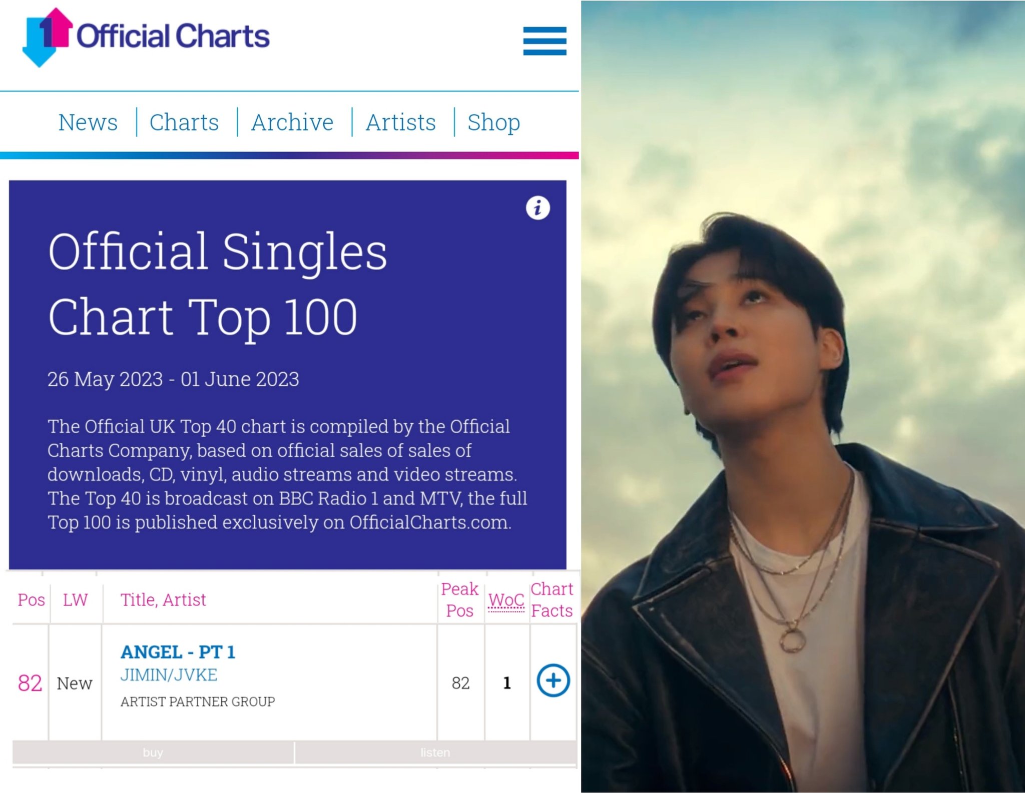지민이 참여한 분노의 질주 "Angel Pt.1"이 주간 영국 Official Single Chart Top 100에 82위로 데뷔했습니다.