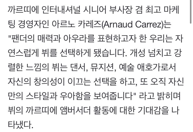 "팬더의 매력과 아우라를 표현하고자 한 우리는 자신연스럽게 뷔를 선택하게 됐습니다. 개성이 넘치고 강렬한 느낌의 뷔는 자기 자신만의 우아함을 보여준다고 까르띠에 앰버서더 활동의 기대감을 나타냈습니다.